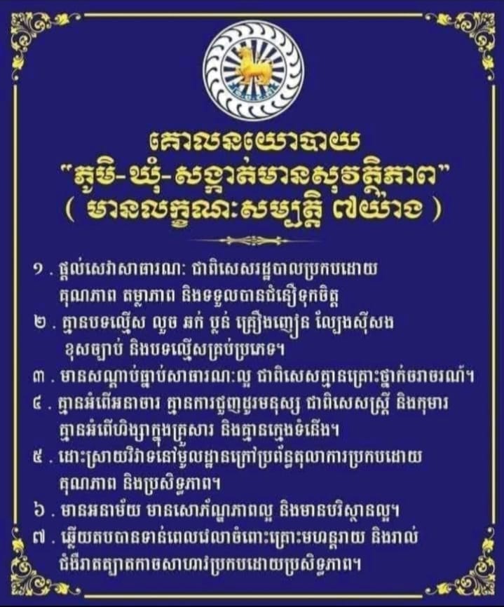 ៣-មានសណ្តាប់ធ្នាប់សាធារណៈល្អ ជាពិសេស គ្មានគ្រោះថ្នាក់ចរាចរណ៍។៤-គ្មានអំពើអនាចារ គ្មានការជួញដូរមនុស្ស ជាពិសេសស្រ្តី និងកុមារ គ្មានអំពើហិង្សា ក្នុងគ្រួសារ និងគ្មានក្មេងទំនើង។