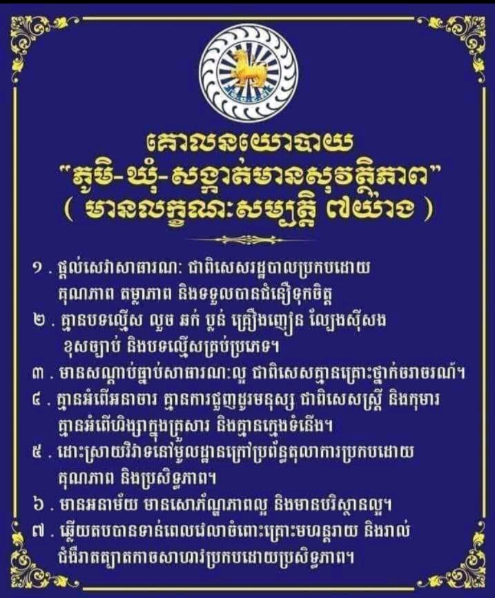 ៣-មានសណ្តាប់ធ្នាប់សាធារណៈល្អ ជាពិសេស គ្មានគ្រោះថ្នាក់ចរាចរណ៍។៤-គ្មានអំពើអនាចារ គ្មានការជួញដូរមនុស្ស ជាពិសេសស្រ្តី និងកុមារ គ្មានអំពើហិង្សា ក្នុងគ្រួសារ និងគ្មានក្មេងទំនើង។