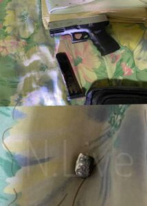 ចំណែកវត្ថុតាងបន្សល់ទុក: កាំភ្លើងខ្លី ម៉ាក Lock19AustriaលេខK4YKZG1YS01-2101989 ចំនួន០១ដើម, បង់កាំភ្លើងចំនួន០១មានគ្រាប់ចំនួន៦, ស្រោមកាំភ្លើងចំនួន០១ ,សំបកគ្រាប់ចំនួន០២, ក្បាលគ្រាប់ក្រពឹតចំនួន០១ និងគ្រាប់កាំភ្លើងចំនួន០១។ ដោយមានស្លាកស្នាមបន្សល់ទុក: ស្នាមគ្រាប់ចូលទៅសៀតផ្កាខាងស្តាំធ្លាយចេញមកសៀតផ្កាខាងឆ្វេង និងស្នាមអារដៃចាស់នៅកំភួនដៃឆ្វេងចំនួន៣កន្លែង។