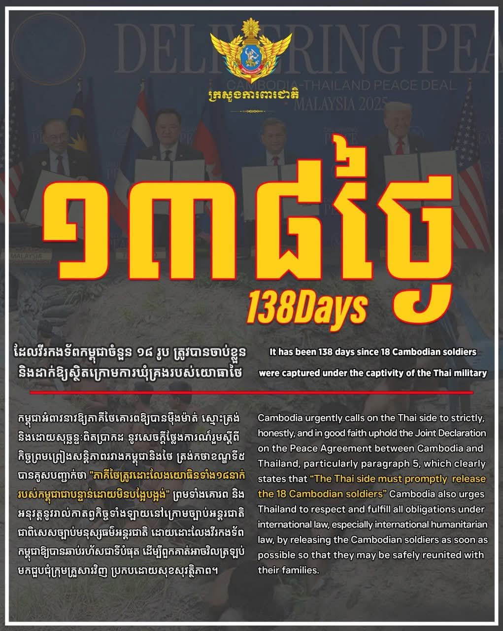 ថ្ងៃនេះជា ថ្ងៃទី១៣៨ ហើយ ដែលវីរកងទ័ពកម្ពុជាចំនួន១៨រូប ត្រូវបានចាប់ខ្លួន និងដាក់ឱ្យស្ថិតក្រោមការឃុំគ្រងរបស់យោធាថៃ។